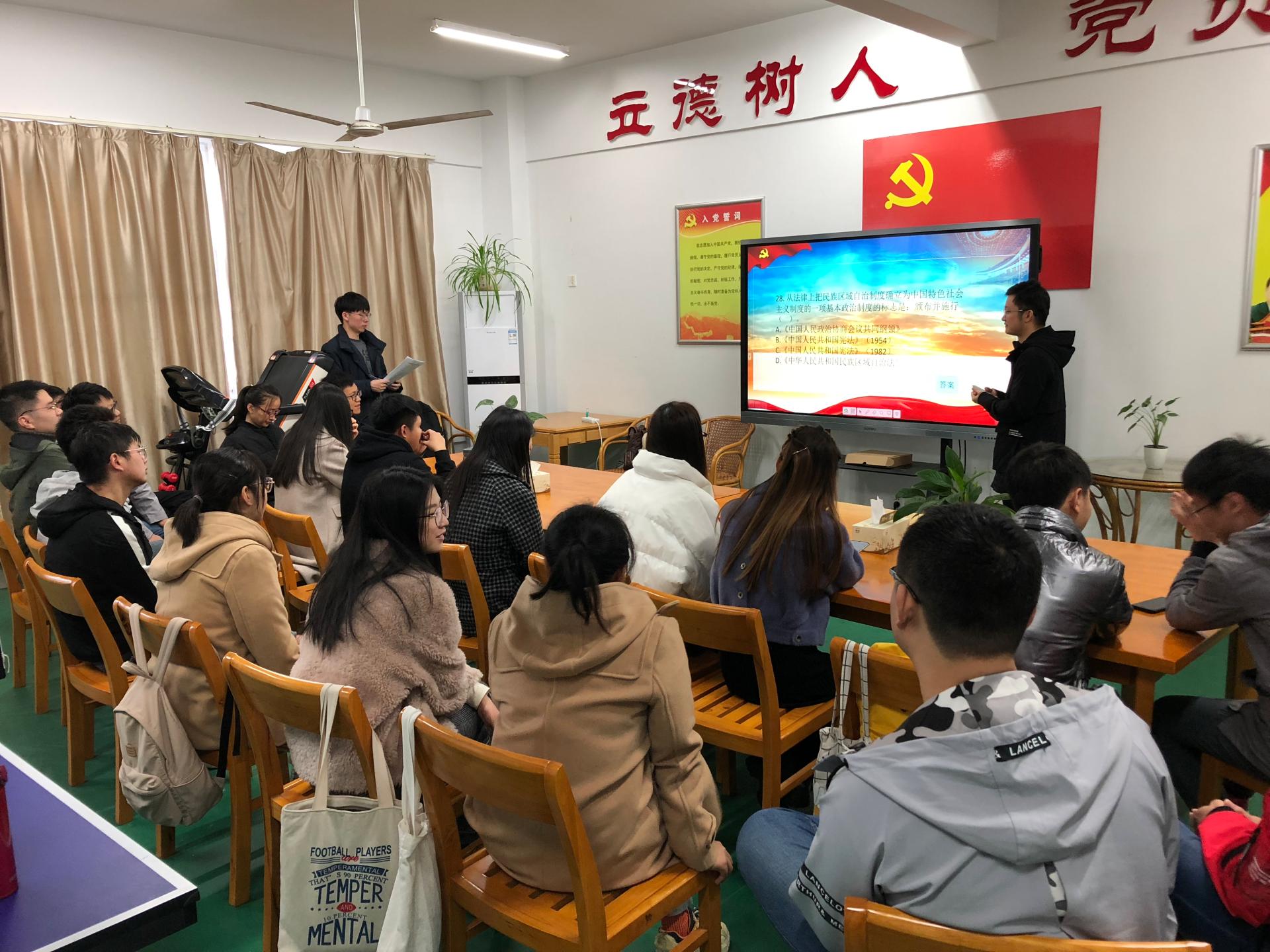 竞赛形式多样、内容丰富,设有个人必答题、个人抢答题、小组必答题、小组抢答题四个环节,竞赛采取积分累积制,从各方面检验同学们的学习成效。参赛的党员和积极分子准备充分、对答如流,现场气氛热烈。在小组竞赛环节中,各小组成员充分讨论,团结一致,在协作答题的过程中也进一步增强了党支部凝聚力。经过激烈角逐,最终孙泽港等六位同学积分领先、获得胜出。