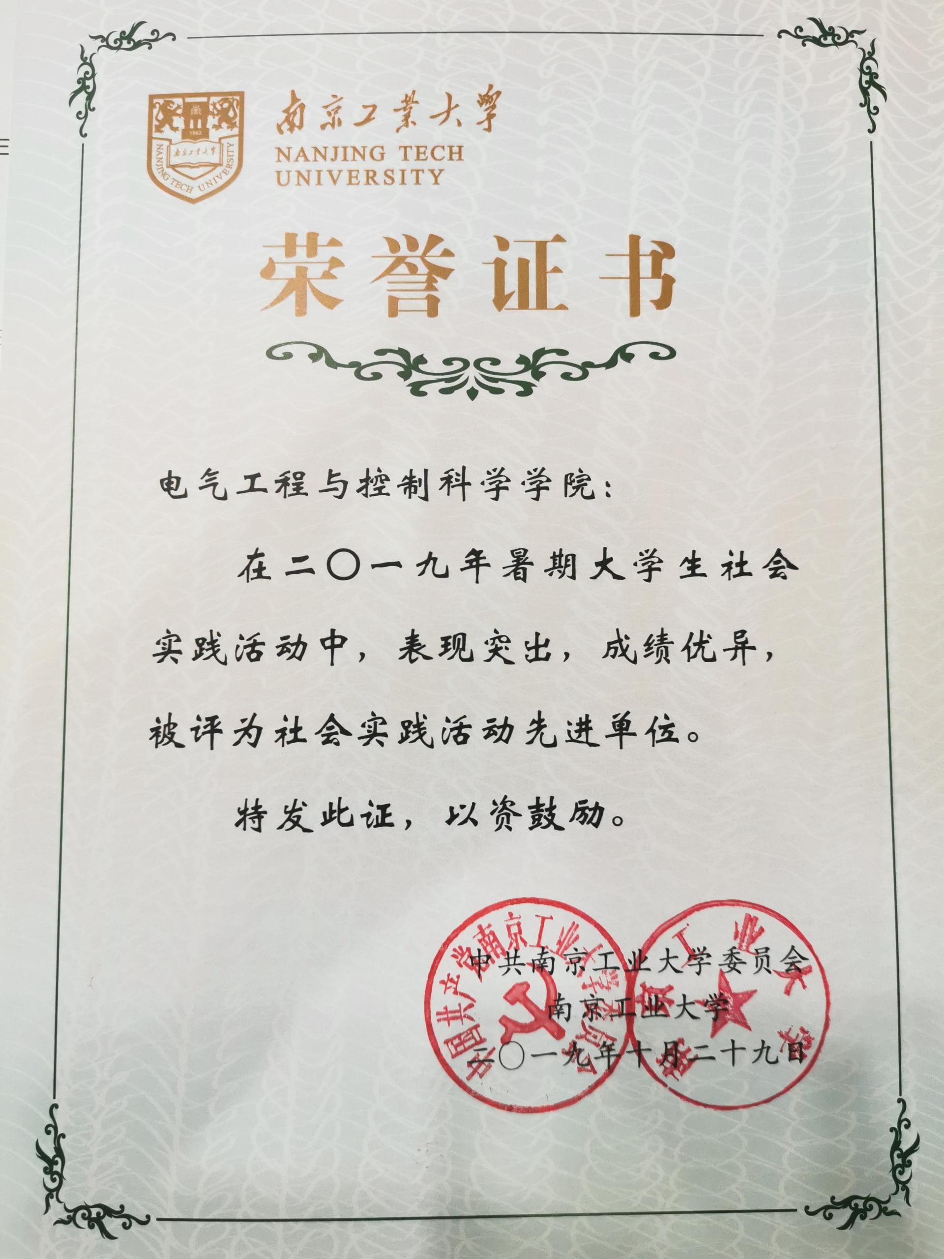 近日,公司下发了《关于表彰2019年老员工暑期社会实践活动先进集体和个人的决定》【南工委办(2019)35号】,公司被评为校“2019年老员工暑期社会实践活动先进单位”。