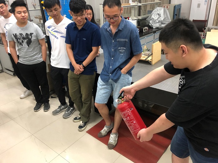 安全培训及应急演习由崔行磊、刘峰老师向课题组研究生讲解在实验室使用高压电、高压气瓶、化学试剂等时操作时的正确操作流程及安全注意事项,分析了高电压、危险化学品的分类及危害,并介绍了危化品的存储管理办法。通过示范正确的操作和安全知识讲解,加深了员工对实验室安全的认识。在现场应急演习,让员工演练突发触电及火灾时,如何切断电源和使用灭火器。
