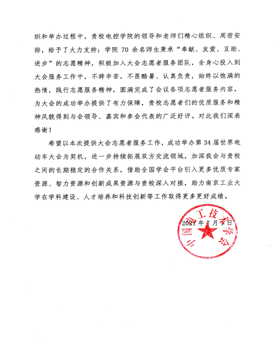 近日,中国电工技术学会向公司发来感谢信,感谢bevictor伟德师生在第34届世界电动车大会暨展览会中做出的贡献。