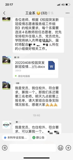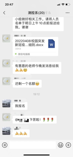 “我是党员,我住校外,我报名!”……近日,电控公司志愿者储备队伍招募群里“复制粘贴式”的报名消息接龙涌现。4月8日晚校疫情防控领导小组下发有关组建校园志愿服务组的通知后,公司党委第一时间部署落实,统筹安排,对班子成员负责的志愿者储备队细化成员数量要求,在各系各党支部中开展报名工作,师生党员响应号召、争相报名,志愿者名额“秒光”。还有不少师生在得知名额已满后仍然申请报名,成为志愿者储备队的“候补人员”。最终63名师生志愿者被编入5个志愿服务储备队,并开展了应急处置方案等有关文件的学习。