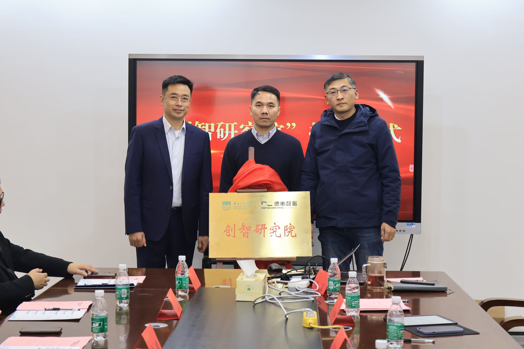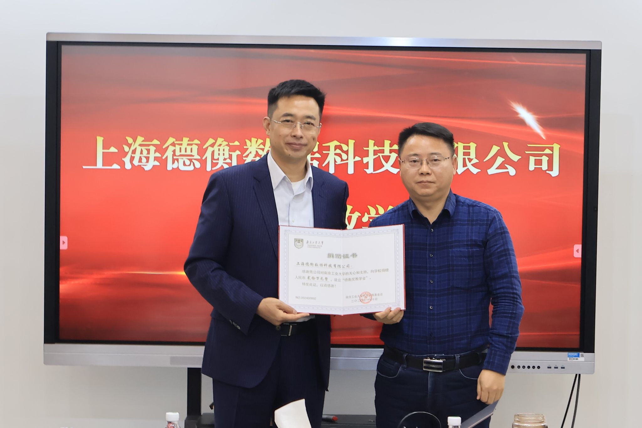 方志经理及王斌董事长分别介绍了单位情况,共同表达了在科研平台建设、双师型队伍建设及教师产学研项目等领域进一步深入合作的期待和信心。王斌董事长、方志经理、科学研究院王宇翔副经理为“创智研究院”揭牌,人事处王曙光处长宣读兼职教授、产业教授聘任决定。为进一步推进全面合作和人才培养工作,德衡数据在公司设立为期5年的奖教(学)金,公司党委书记陈晨子代表受赠首批20万奖教(学)金,对外合作处伏永祥处长为企业颁发捐赠证书。