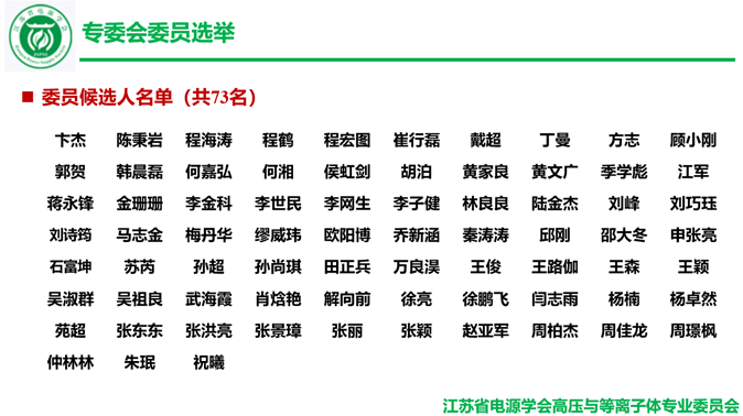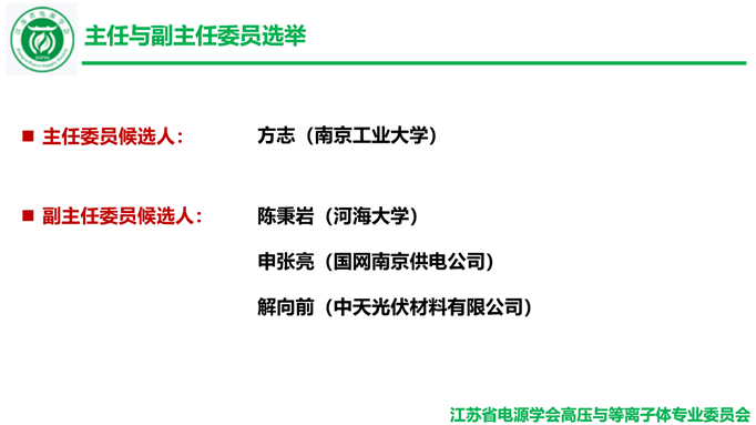 会上江苏省电源学会理事长阮新波教授代表学会致辞,江苏省电源学会秘书长周群女士宣读了高压与等离子体专委会成立批复文件。经投票选举,通过了首届江苏省电源学会高压与等离子体专委会成员共73人,bevictor伟德方志教授当选委员会主任委员,河海大学陈秉岩教授、国网南京供电公司申张亮主任、中天光伏材料有限公司解向前总工程师当选副主任委员。经主任委员提名,bevictor伟德祝曦副教授当选委员会秘书长,河海大学丁曼副教授、东南大学仲林林副教授当选委员会副秘书长。
