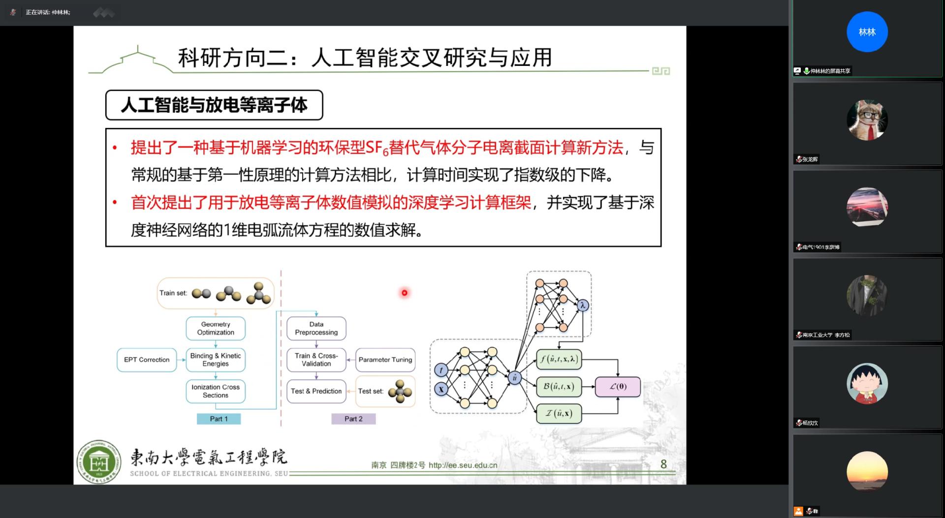 仲老师首先介绍了自身两个研究方向,“高电压与放电等离子体”和“人工智能交叉研究与应用”。作为国内最早一批将人工智能技术引入等离子体数值模拟的研究人员,仲老师深入浅出的为师生讲解了他开展的人工智能与等离子体仿真、多物理场建模、电力设备智慧运维等领域的交叉研究。之后,仲老师介绍了东南大学电气工程公司概况及招生情况,鼓励公司员工报考该校研究生。报告尾声与公司师生就人工智能在高电压领域应用以及研究生如何开展仿真研究进行了热烈交流。