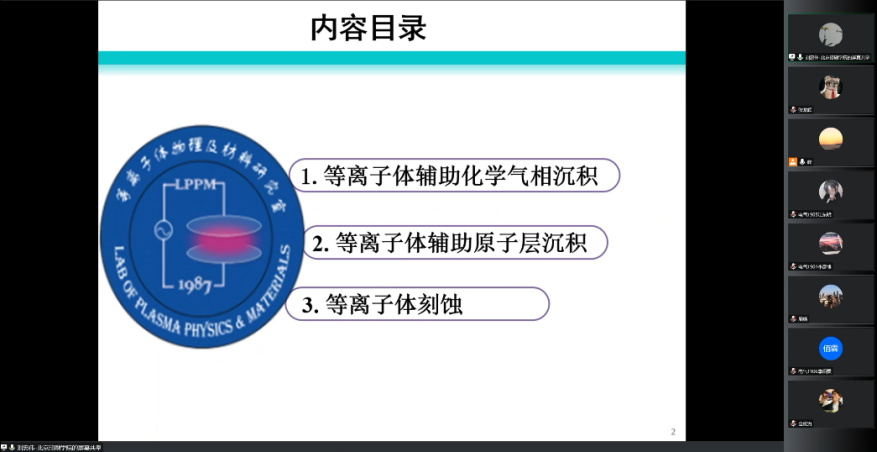 刘老师首先介绍了他们课题组在食品包装和医疗领域中等离子体辅助化学气相沉积制备高阻隔薄膜的应用实例。在等离子体辅助原子层沉积部分,刘老师详细阐述了其原理和在半导体领域、荧光粉包覆和催化剂制备中的应用。之后,刘老师通过介绍半导体领域Bosch工艺和低温工艺刻蚀存在的缺点,引出了当前研究热点也是他们将要开展的原子层刻蚀技术技术。刘老师的报告深入浅出,循序渐进,具有较强的科学价值和应用价值,报告尾声,师生与刘老师进行互动交流。