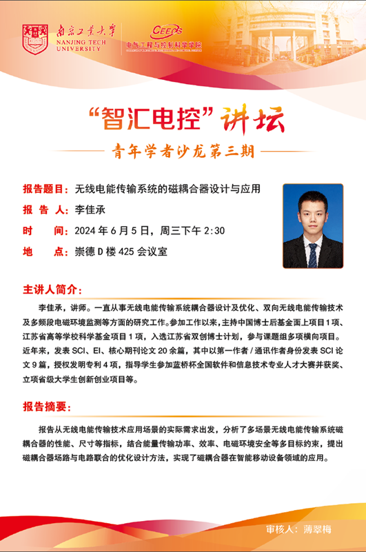 报告过程中,李佳承老师从无线电能传输技术应用场景的实际需求出发,分析了多场景无线电能传输系统磁耦合器的性能、尺寸等指标,结合能量传输功率、效率、电磁环境安全等多目标约束,提出磁耦合器场路与电路联合的优化设计方法,实现了磁耦合器在智能移动设备领域的应用。