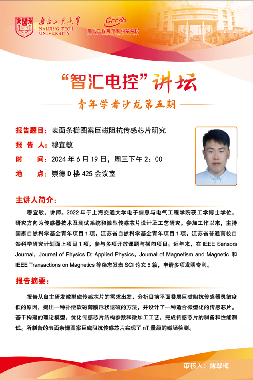 穆宜敏老师的报告题目为《表面条栅图案巨磁阻抗传感芯片研究》,从自主研发微型磁传感芯片的需求出发,分析目前平面叠层巨磁阻抗传感器灵敏度低的原因,提出一种补偿软磁薄膜形状退磁的方法,并设计了一种适合微型化的传感芯片。基于构建的理论模型,优化传感芯片结构参数和微加工工艺,完成传感芯片的制备和性能测试。所制备的表面条栅图案巨磁阻抗传感芯片实现了nT量级的磁场检测。