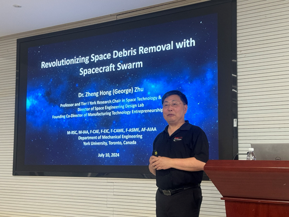 朱正宏教授为在场师生做题为“Revolutionizing Space Debris Removal with Spacecraft Swarm”的学术报告。介绍了航天器群清除空间碎片的研究进展,重点展示了基于图的slam方法以及基于行为的集群控制所取得的成果。这些成果包括对未知目标的聚合、避撞及反弹行为的研究,从而实现对碎片的清除。在交流环节,现场师生与朱教授就协同控制理论与方法、智能仿生与加拿大生活等方面进行了热烈讨论。