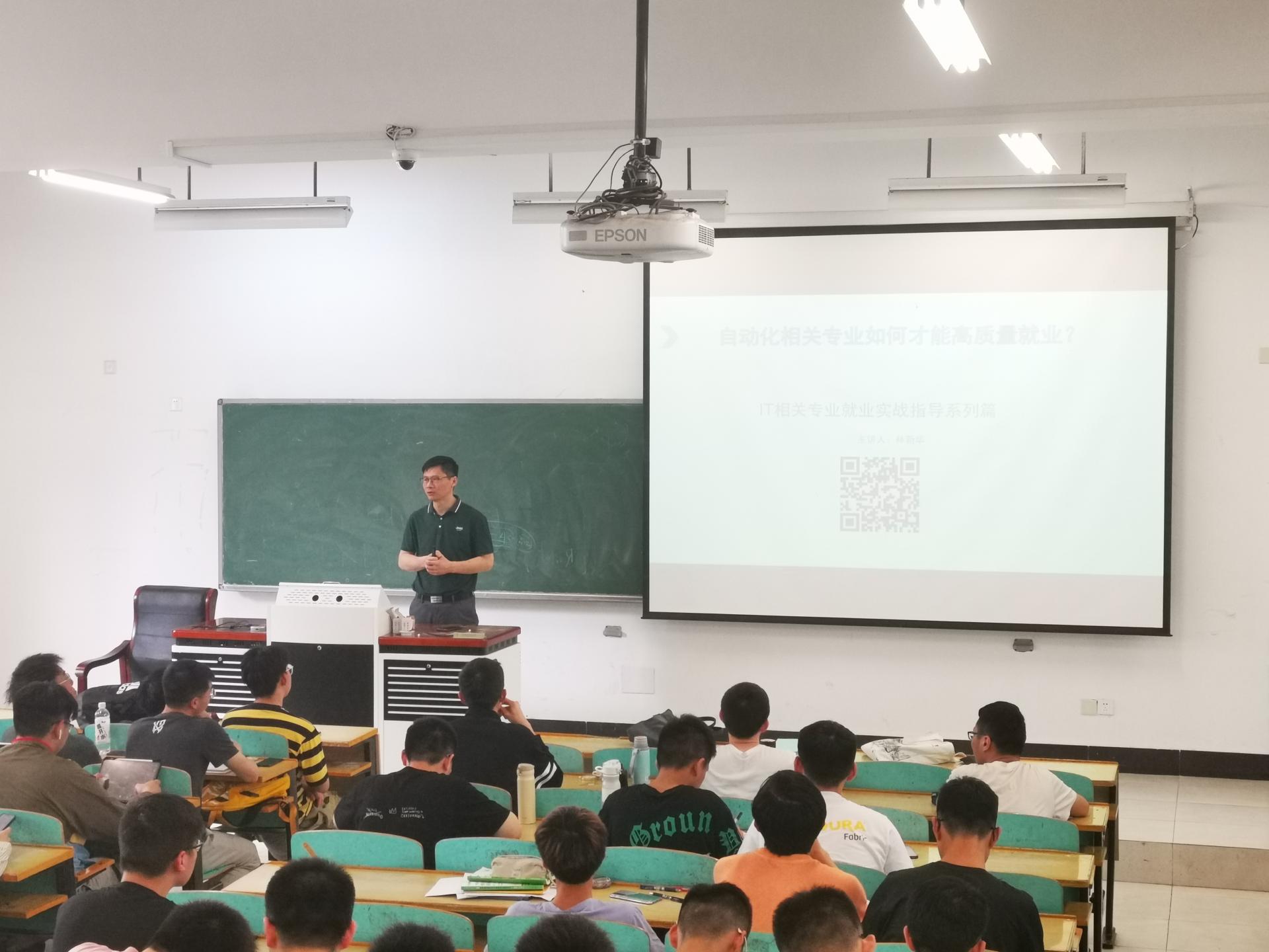 潘志颖老师对员工林新华董事长的到来表示欢迎,并简要介绍了当前员工就业去向与选择的疑惑。接着,林新华董事长以《自动化相关专业如何才能高质量就业》为题,结合自己的工作经历,就如何更好的认识自我提升自我、如何做好职业规划实现高质量就业等方面做了重点介绍。关于就业选择方面,林新华董事长建议大家既要顺应技术互融这一时代主题,也要加强自身综合能力建设,抓住校招黄金机遇。最后,林新华董事长与在场同学进行了现场互动,对讲座中涉及的问题开展了更深入的交流与探讨。