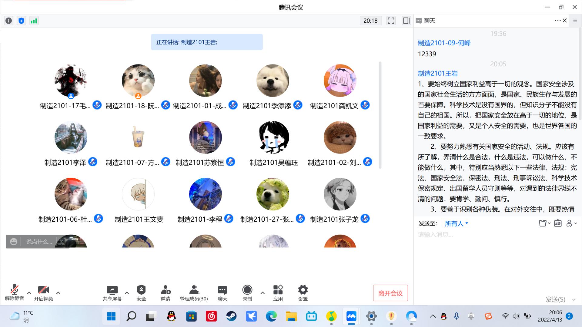 电气2101班团支部发挥员工的主观能动性,以宿舍为单位搜集新时代国家安全成就案例,引导支部成员畅谈感悟与启示。自2101班团支部集中观看“安仔说国家安全”系列微视频、学习研讨《习近平关于总体国家安全观论述摘编》,并就学习内容开展分享交流。制造2101班团支部开展集中学习答题,进一步强化青年员工维护国家安全的责任感与使命感。与会同学展开热议,纷纷表示,维护国家安全,我们责无旁贷。