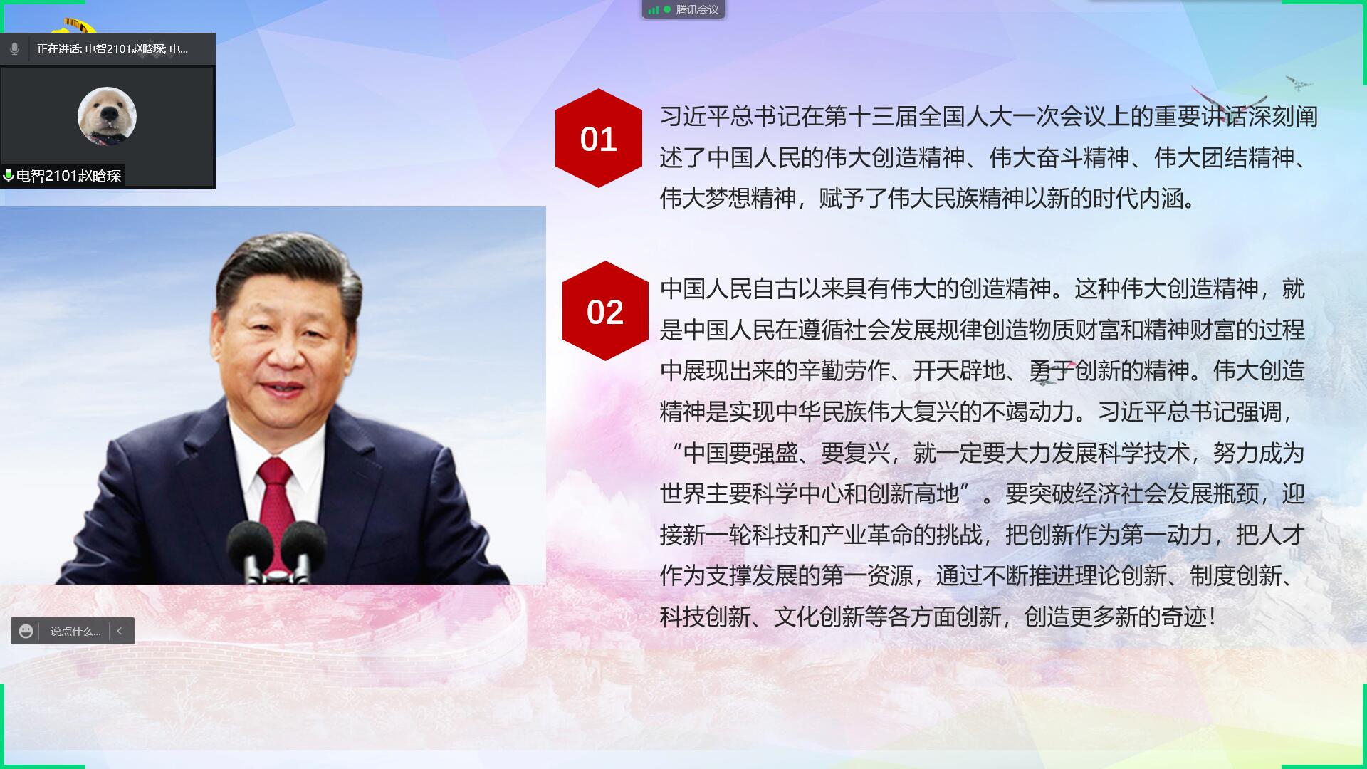 在“伟大创造精神”新思想公开课上,2020级团总支负责人孟令驰领学习总书记关于“伟大创造精神”的重要论述,电智2101班团支书赵晗琛、自2104班团支书尹熙灏结合本职工作与学习内容交流心得体会,与会成员就所学课程分享课程思政案例,并进行深入探讨和交流。