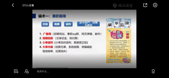 徐东老师详细地介绍了预防电信网络诈骗安全注意事项,并以真实案例向大家介绍了刷单诈骗、校园贷诈骗、冒充熟人诈骗、冒充公检法诈骗、投资理财诈骗等几种常见电信网络诈骗方式,让同学们熟悉掌握电信网络诈骗的种类、特点及惯用招数,提醒同学们要时刻保持警惕,保护好个人信息,不轻信陌生人,不轻易转账,谨防上当受骗。讲座结束后,公司还组织班级防诈宣传员在亚青田径场开展防诈宣传素质拓展活动,进一步增强员工抵制电信网络诈骗的“免疫力”。