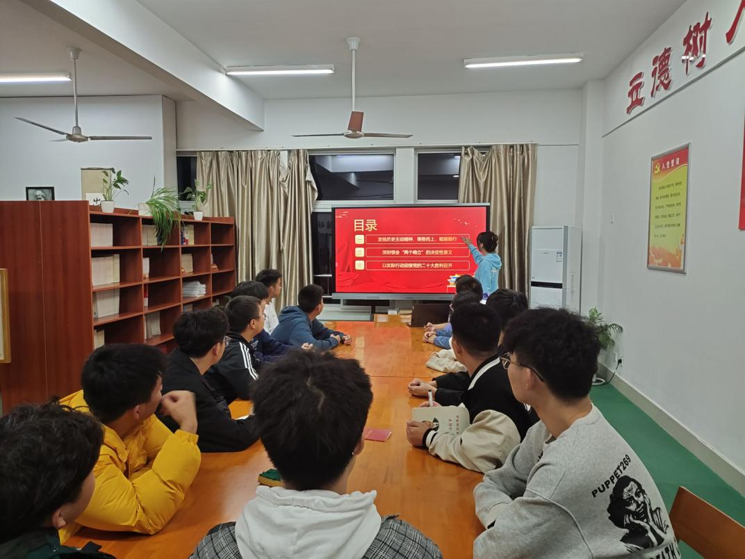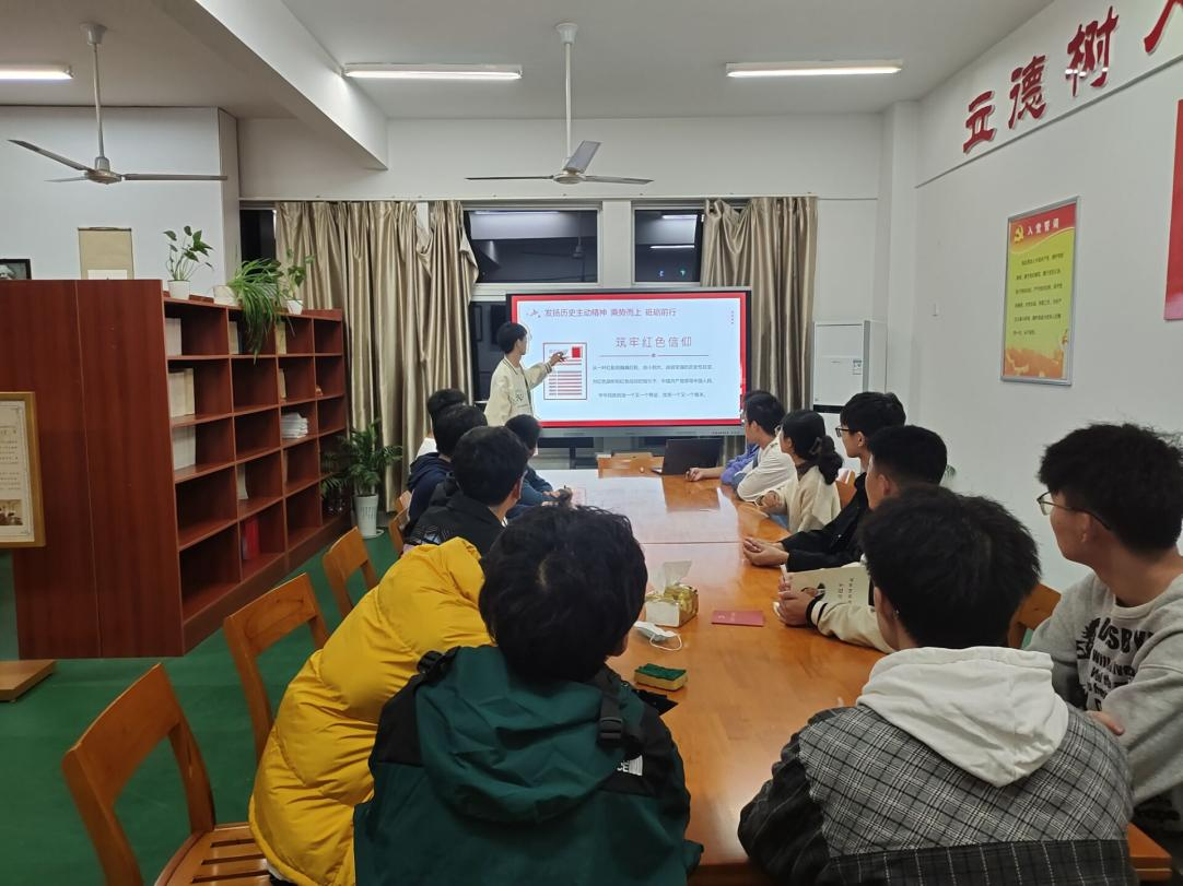 会上,王馨懿同学从“筑牢红色信仰”“夯实红色基因”“传承红色精神”和“保持红色作风”四个方面介绍了发扬历史主动精神,号召同学们意气风发向着第二个百年目标奋勇前行。接着,孙弈骁同学从理论、历史、实践三个维度,引导同学深刻领会“两个确立”的决定性意义。宋子祥同学以国际形势和历史背景切入,从现实生活中的小事出发举列,更加坚定了同学们走向“必由之路”的信心。与会同学认真聆听讲解、查阅资料,将以实际行动和优异成绩迎接党的二十大胜利召开。